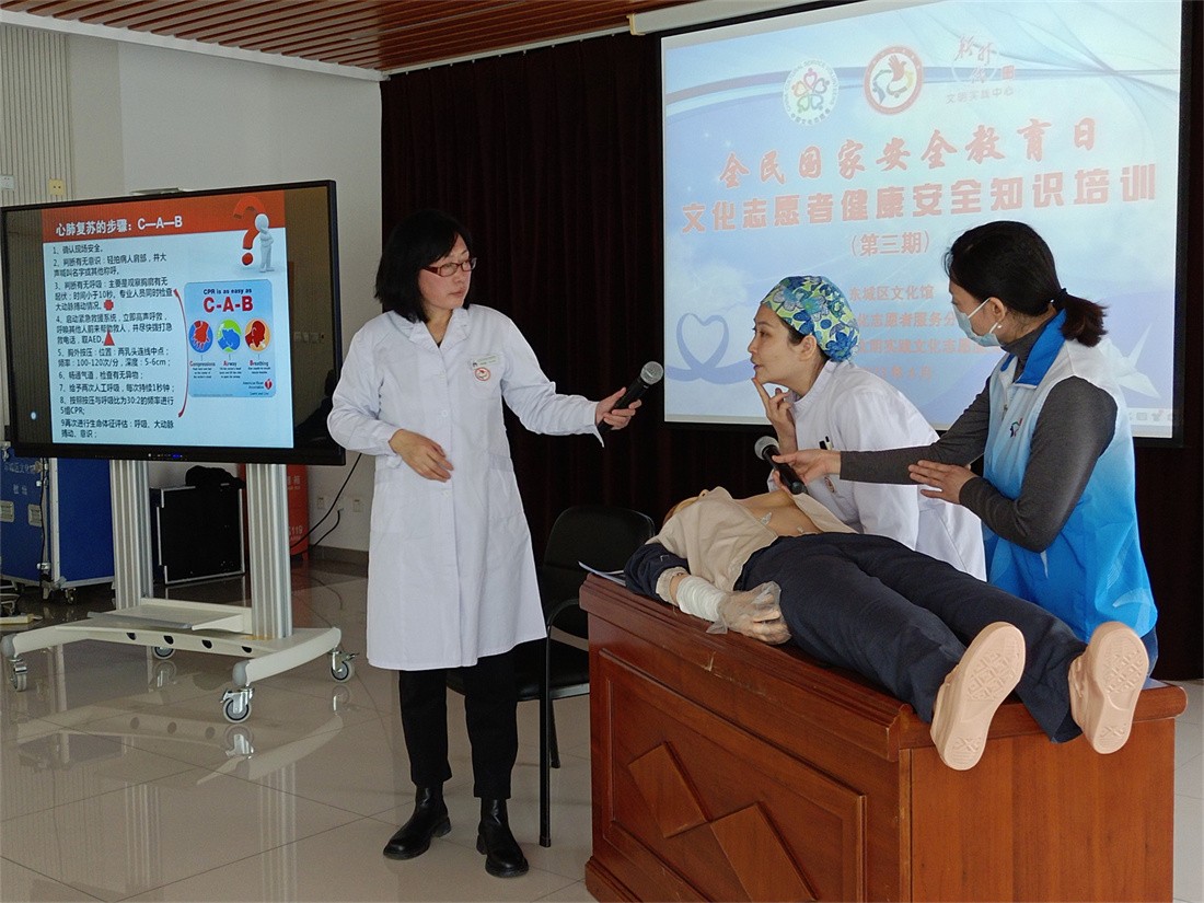 为扎实推进东城区文化志愿服务健康发展,加强文化志愿者健康安全和应急自救等知识普及,4月14日上午,东城区文化馆文化志愿者服务分中心联合服务保障部,以全民国家安全教育日为契机,特别邀请东城区人大代表、东城区妇幼保健院主任医师苏秋梅及优秀护士长李楠,为来自东城区17个街道文化志愿者服务站、7个社区文化志愿者之家以及热心于志愿服务的文化志愿者项目带头人进行健康安全知识培训。