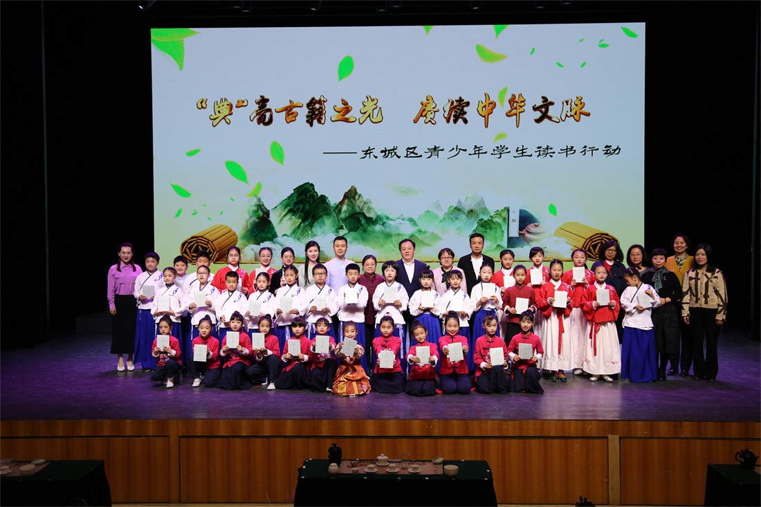 文字承载记忆,典籍传承智慧。2023年4月22日东城区文化馆和东城区少年宫联合推出的“典”亮古籍之光 赓续中华文脉——东城区青少年学生读书行动在风尚剧场举办。东城区文化和旅游局副局长俞浩、东城区教委课外活动办公室主任高青、东城区文化馆馆长白昂、东城区少年宫主任王越等领导、专家及朗读爱好者,少年宫的小朋友们150余人参与活动。