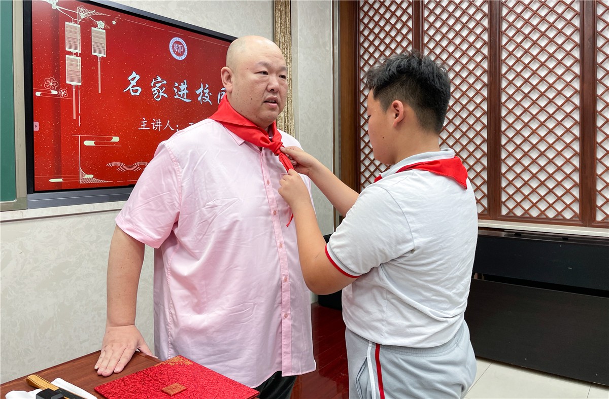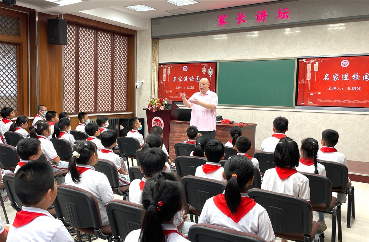 6月12日,东城区文化馆【艺+1名家讲堂】邀请著名评书、相声演员,北京曲艺家协会副主席王玥波走进北京市东城区府学胡同小学,为学生们开展评书普及讲座。府学胡同小学书记谢丽娟为王玥波颁发家长讲坛聘书,少先队员代表敬献了红领巾。