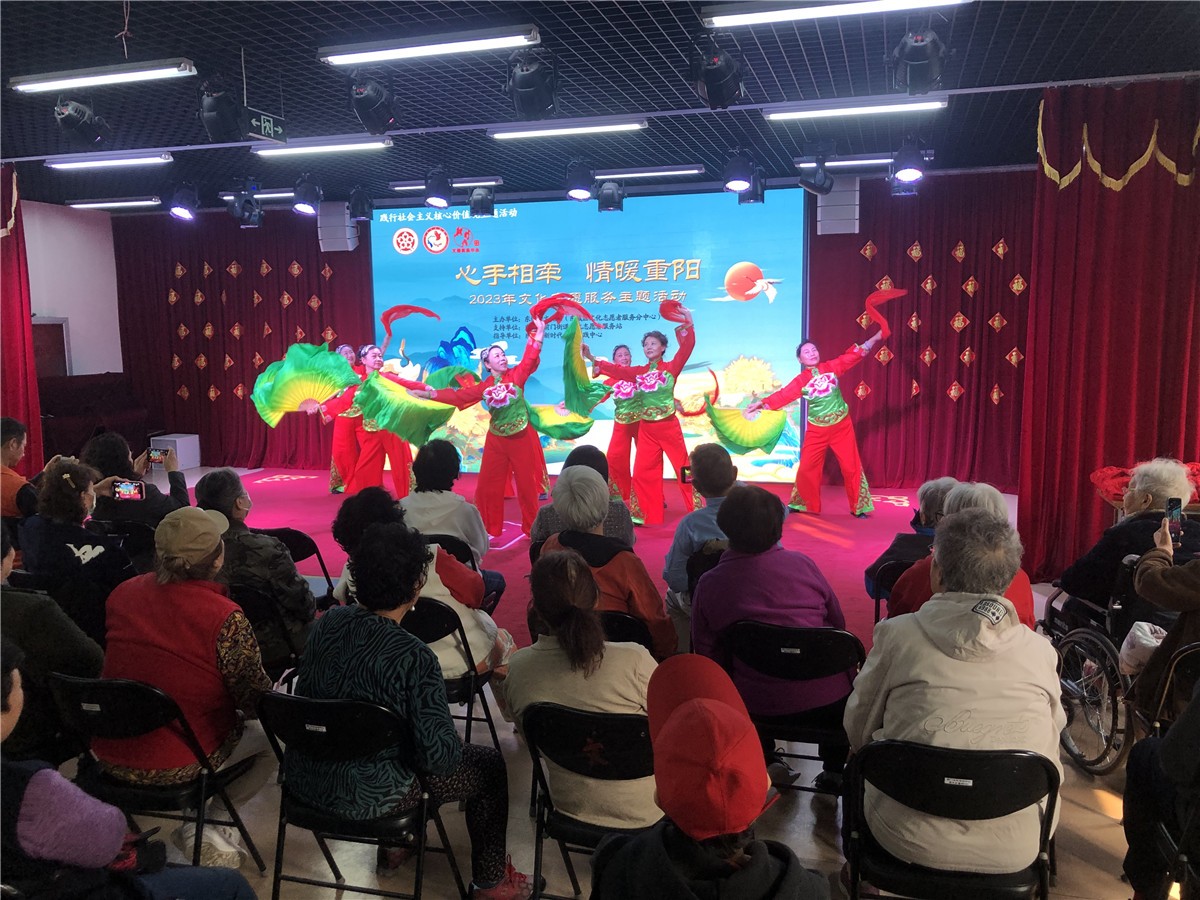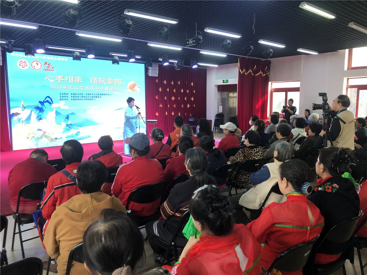 岁岁重阳,今又重阳。10月23日,我们又迎来了一年一度的传统佳节——重阳节。为大力培育和践行社会主义核心价值观,弘扬中华民族尊老爱老的传统美德,进一步营造敬老、爱老、助老的良好社会风尚,东城区文化馆(东城区文化志愿者服务分中心)携手前门街道文化志愿者服务站举办“心手相牵 情暖重阳” 2023年文化志愿服务主题活动。区人大代表、东城区文化馆副馆长王敏,前门街道市民活动中心副主任李雪,前东社区养老服务驿站站长那再兴,草厂社区养老服务驿站站长刘宝三,文化志愿者以及养老驿站的老人共80人参加了活动。