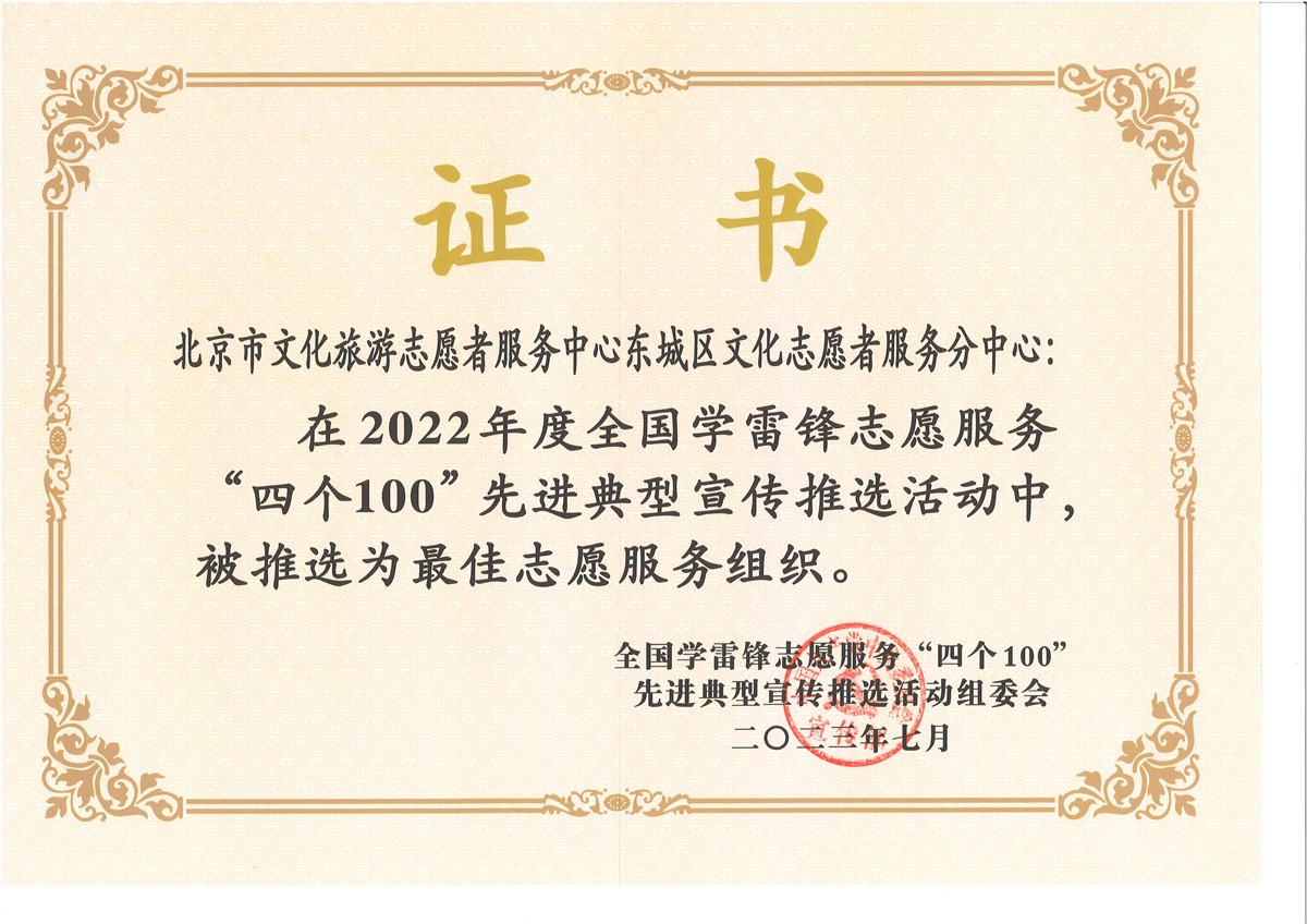 学雷锋志愿服务“四个100”先进典型是中央宣传部、中央文明办组织评选的文明实践志愿服务领域全国最高级别奖项。此次获奖极大的鼓舞了分中心的志愿者们,他们纷纷表示,将以今天取得的成绩做为新的起点,不忘初心,不负韶华,继续做好文化志愿服务,传承优秀文化,弘扬正能量。继续做社区文化建设的践行者、引领者,为东城文化强区和首都文化中心建设做出新的更大的贡献。