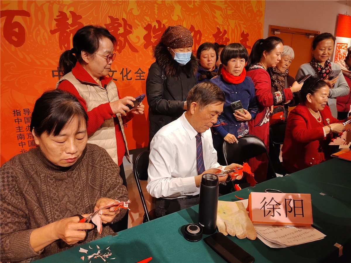 北京剪纸传承人剪纸大师徐阳主持了开幕式并宣读了南京大学文化与自然遗产研究所副所长陈竟教授的致辞;南京大学文化与自然遗产研究所全国剪纸联盟副主任,国家级非遗传承人伏兆娥;南京大学文化与自然遗产研究所全国剪纸联盟副主任陈维珍;东城区文化馆副馆长任莉出席了开幕式并致辞。伏兆娥、陈维珍、徐阳等剪纸艺术家为大家现场表演民间脱稿剪纸,并将表演的作品赠送给参加开幕式的群众。