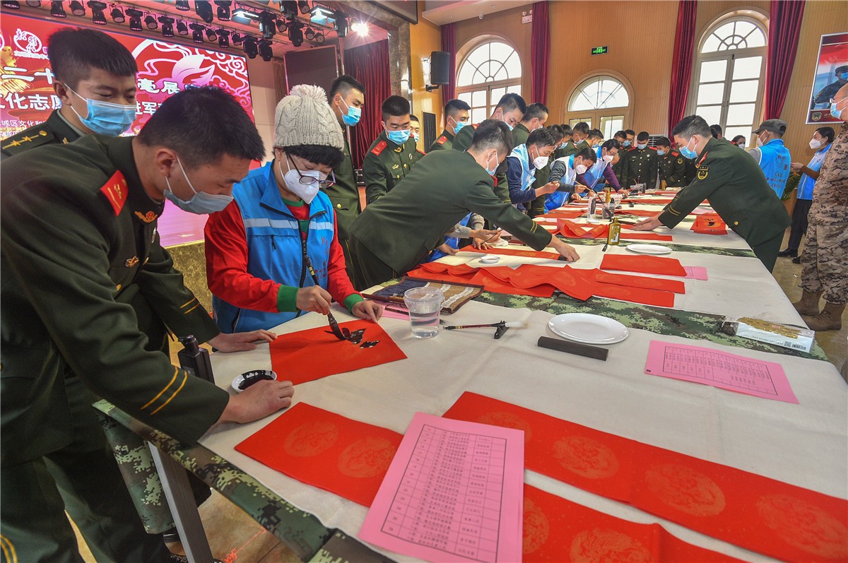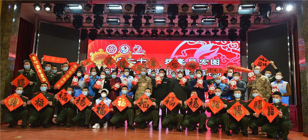 为深入贯彻落实党的二十大精神,践行社会主义核心价值观,促进中华优秀传统文化传承与发扬,营造浓郁的新春节日氛围和积极向上的文化志愿服务氛围。 1月13日上午,由东城区文化和旅游局主办,东城区文化馆、东城区文化志愿者服务分中心、东城区新时代文明实践志愿服务队承办的“喜庆二十大 挥毫展宏图”东城文化志愿者送福进军营联谊活动在北京武警总队执勤第二支队如期举行。区人大代表、区文化馆副馆长;民进书画家;国家级剪纸非遗传承人以及东城区优秀文化志愿者共15人以书写春联、剪窗花的形式向武警官兵进行了慰问,与官兵们喜送祝福,共迎新年。